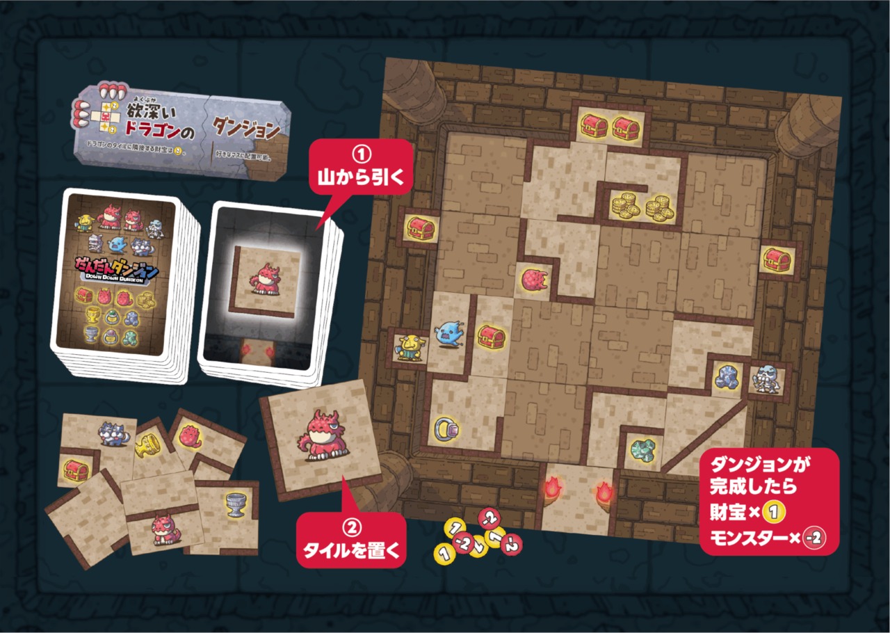 だんだんダンジョンは、1分で説明できる簡単なルールで、毎回異なる展開を楽しめるタイル配置ダンジョン作成ゲームの決定版です。クニツィア氏による最小限で美しい無駄のないルールと、たかみまこと氏による親しみやすく遊びやすいアートワークは必見です。
