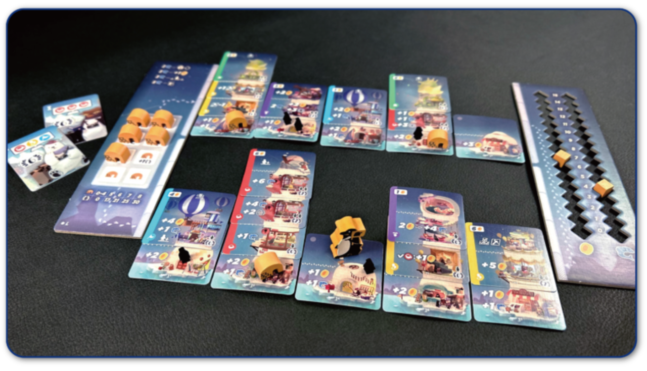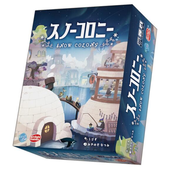 『スノーコロニー』は、手元の10マスの町をぐるぐる巡り、建物を増築してマスを成長させていくすごろくゲームです。