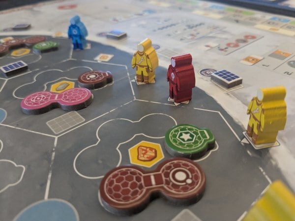 •アクションフェイズ:プレイヤーは交代で宇宙飛行士を月面に派遣し、資源の収集、建造物の建設、あるいはプロジェクトの資金調達を行います。